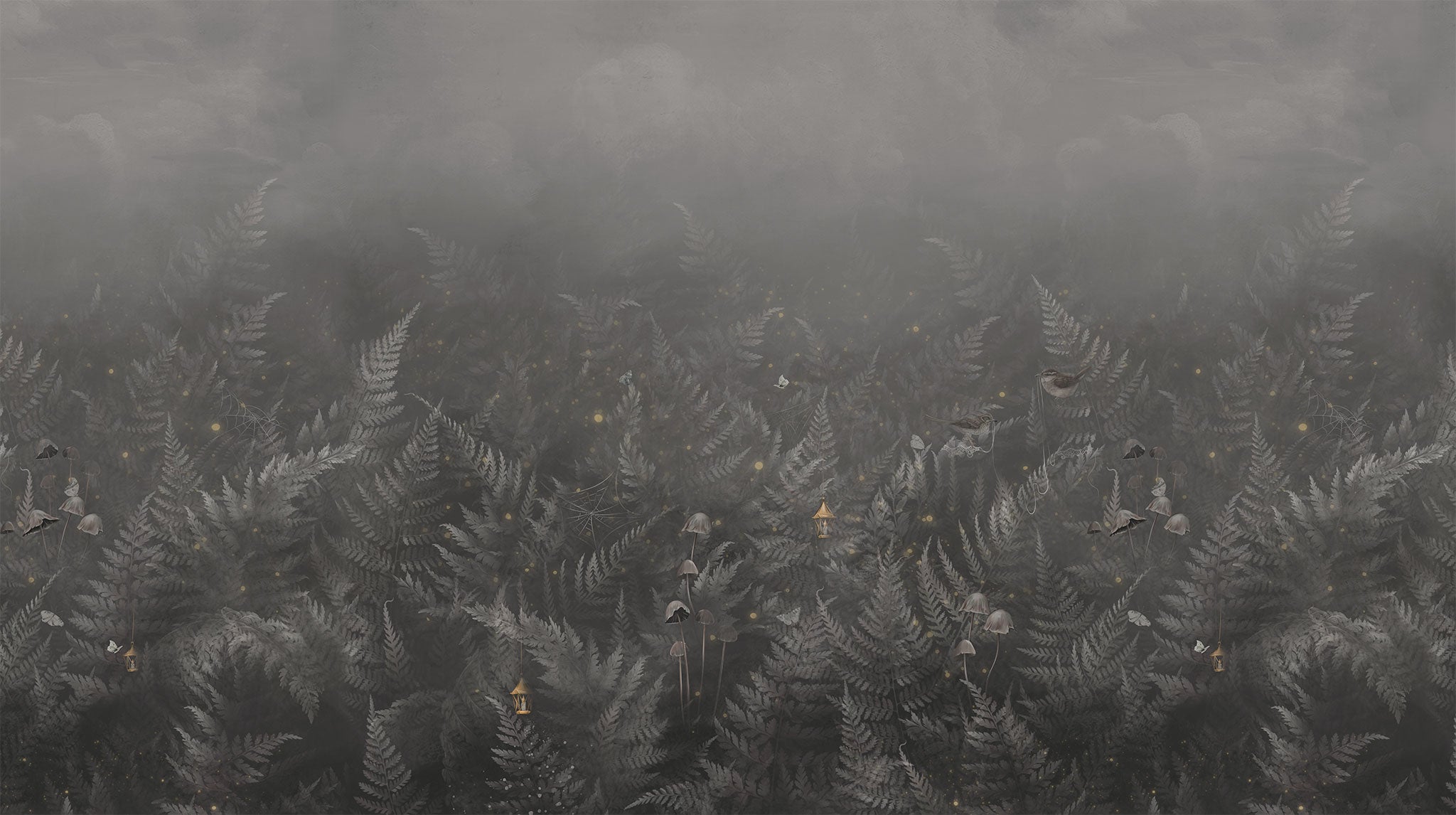 Darkwood Dreams taucht dich ein in eine mystische Welt aus Farnen, Nebel und leuchtenden Details. Glühwürmchen flackern zwischen Spinnennetzen und Pilzen, kleine Vögel huschen durch die Szene, fast lautlos, wie ein flüchtiger Traum. Diese Tapete bringt einen Hauch Magie in den Raum.